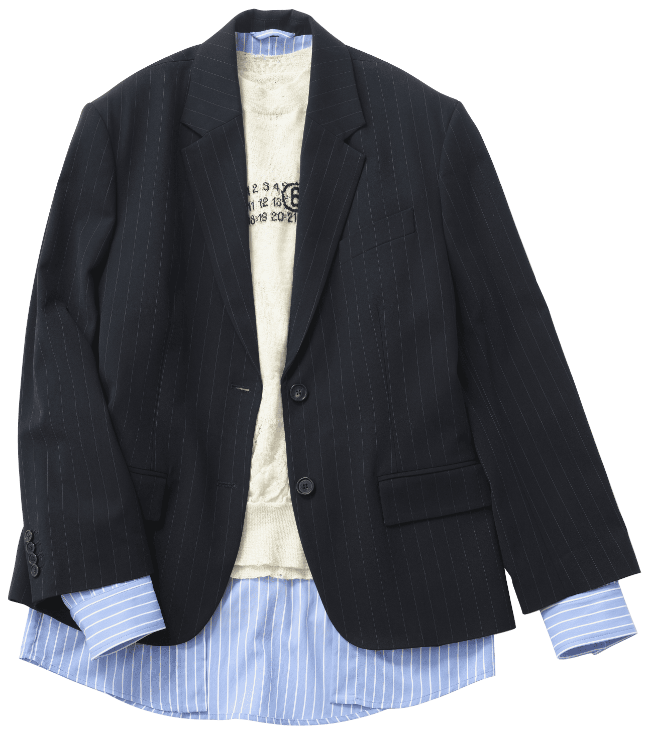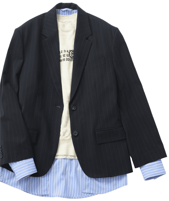 シャツとドッキングのオーバーサイズのテーラードジャケット。一枚でスタイリングが決まります。