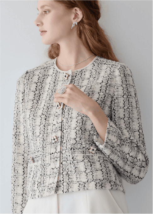 繊細な糸で織り上げた生地にフラワーボタンをあしらったエレガントな佇まいのジャケット。コンパクトなシルエットが美しく身体に沿い、日常に洗練されたラグジュアリーを添える一着です。