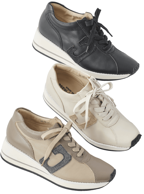おでかけしたくなる本革スニーカーは、4.5cmヒールで歩行も楽らく。サイズ展開は3E、22.0〜
