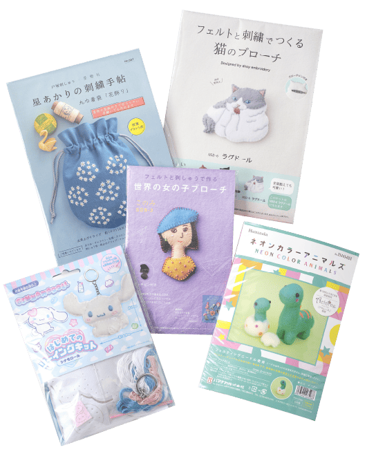 羊毛フェルトやフェルトで作るマスコット、6才からできるかわいいキャラクターなどのソーイングキットをご用意。刺しゅう入りの巾着袋やブローチ制作の本格派もございます。ぜひ、この機会に。