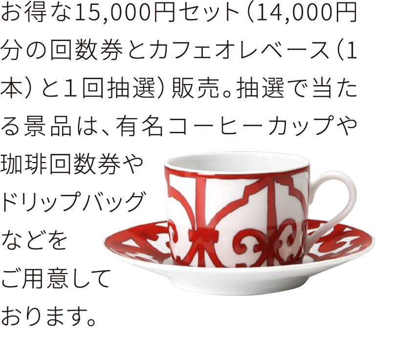 お得な15,000円セット(14,000円分の回数券とカフェオレベース(1本)と1回抽選)販売。抽選で当たる景品は、有名コーヒーカップや珈琲回数券やドリップバッグなどをご用意しております。