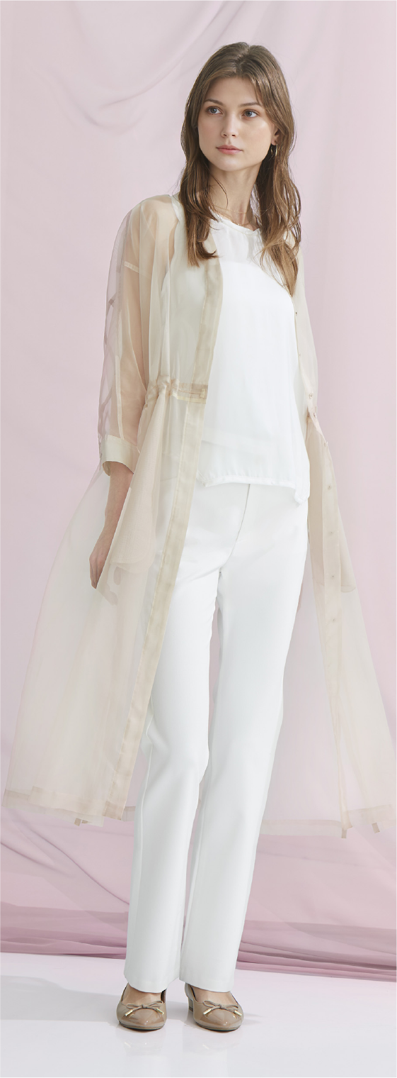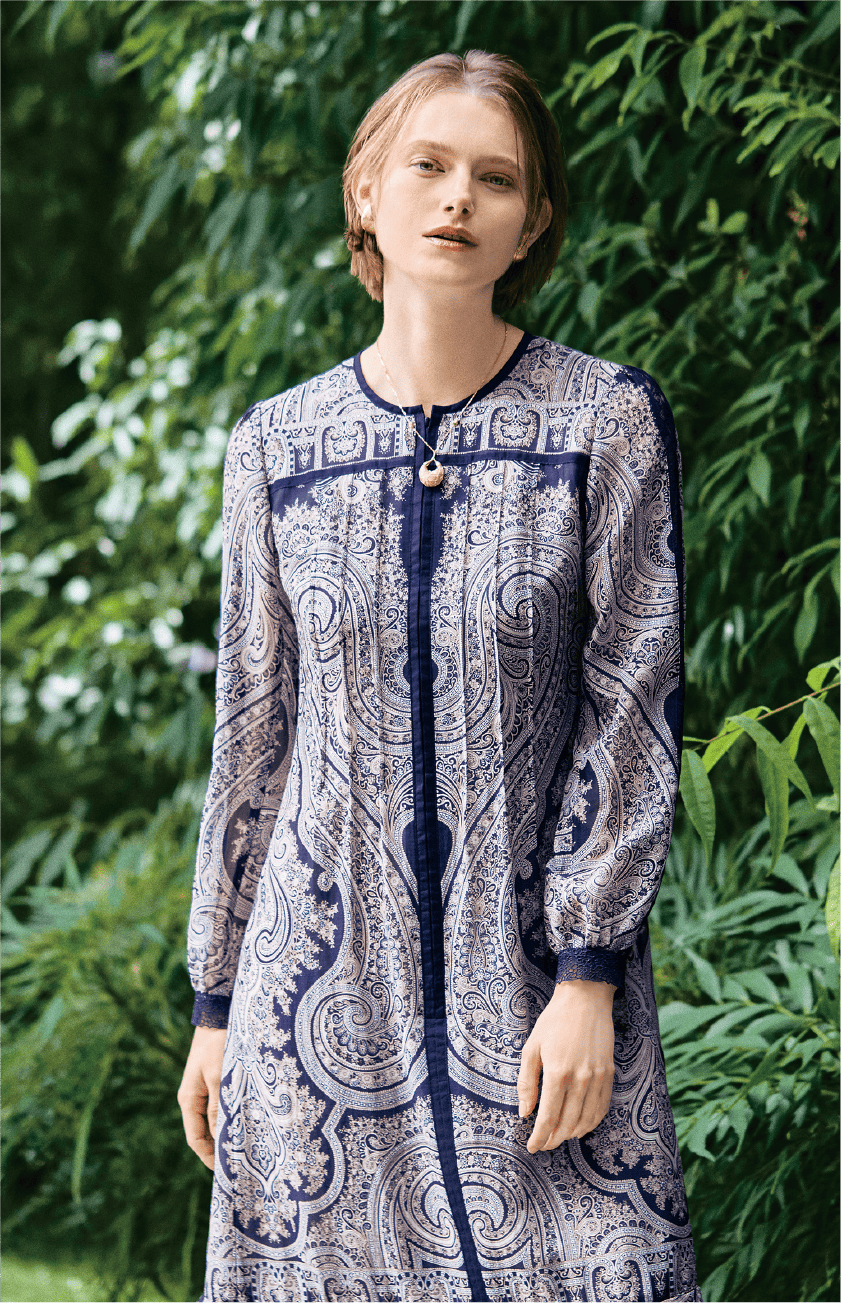 コットン×シルクのボイル生地が軽やかに揺れて上品。繊細なアートプリントが縦ラインを強調して、すっきりした印象に。前ファスナー使用で脱ぎ着もスムーズ。日常から特別なシーンまで、この一枚で美しく決まります。