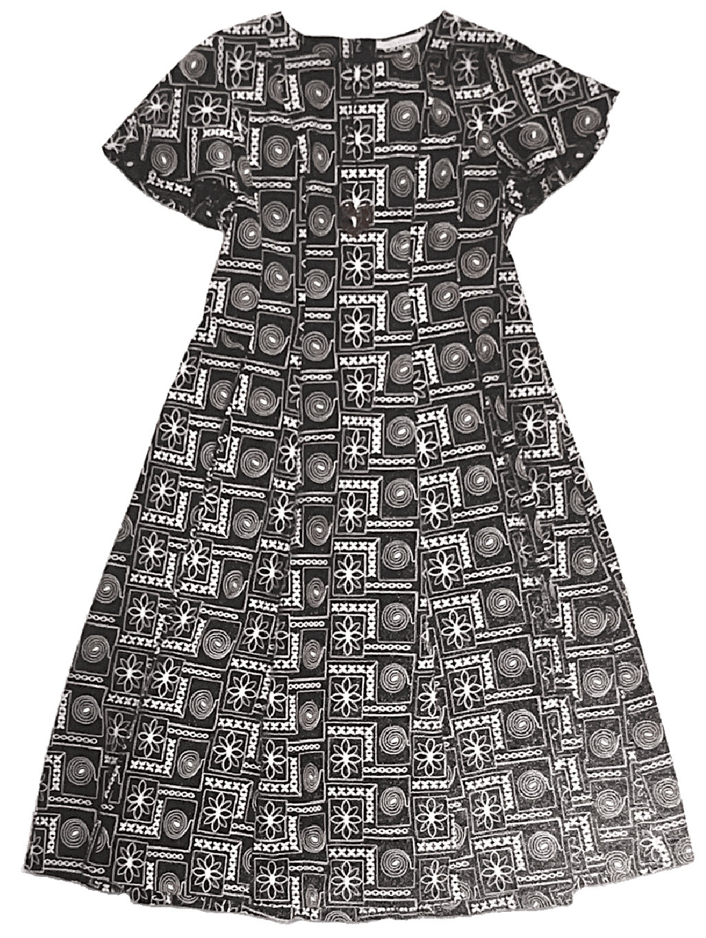 コットンレースのやさしい風合いや体のラインを拾わないふんわりとしたAラインシルエットが魅力。幾何学模様とフラワーモチーフの繊細な柄が華やかさを添えます。