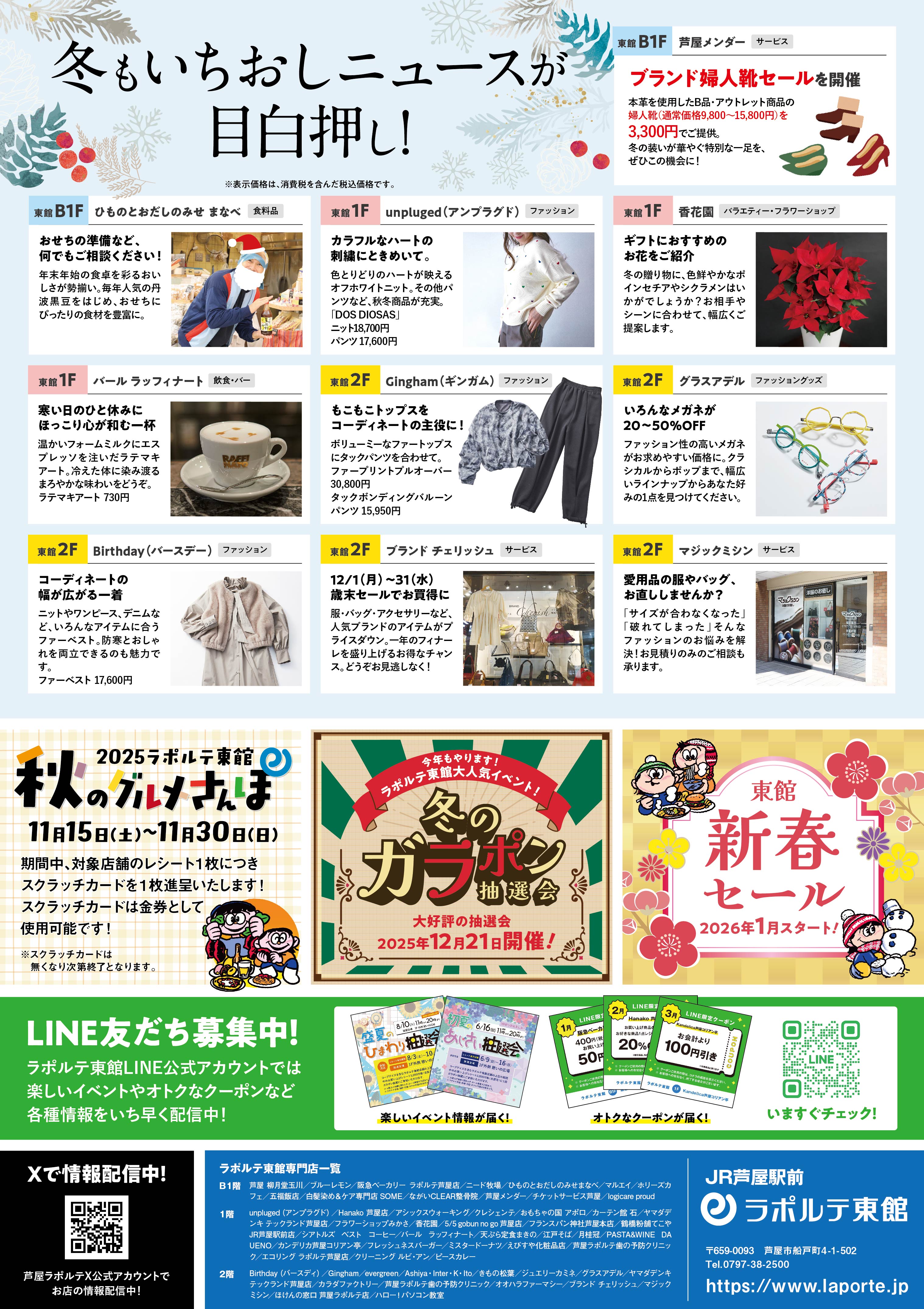 - ラポルテ北館にJR芦屋駅北自転車駐車場(0797-31-2988)がございます。ラポルテでお買い物された方に駐輪利用料金(100円)を返金するサービスがございます。サービスはJR芦屋駅北自転車駐車場をご利用いただいた場合のみ適用されます。詳細は「ラポルテの駐輪場のご利用について」をご確認ください。 - サービスの適用は、自転車ご利用の方のみとなります(原付は不可)。また、一部お取り扱いしていない店舗がございます。事前に各店へお問い合わせください。