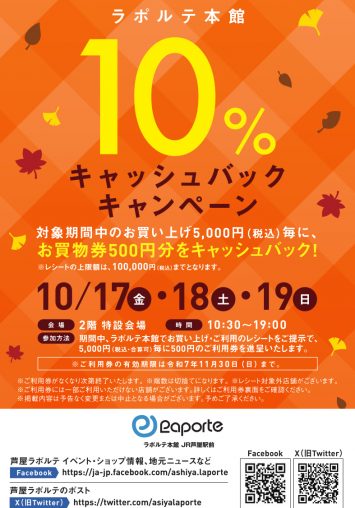 ラポルテ本館 「10%キャッシュバックキャンペーン」 期間:10月17日(金)~10月19日(日)の3日間 概要:期…