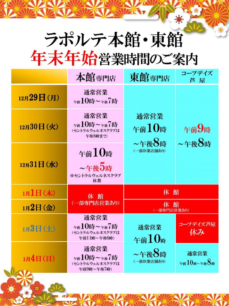 ラポルテ本館・ラポルテ東館 年末年始の営業のご案内 期間:2025/12/27~2026/1/4 今年1年、皆様にご愛顧いただきまして本当にありがとうございました。 2026年度も変わらず皆様のご来館をお待ちしております!