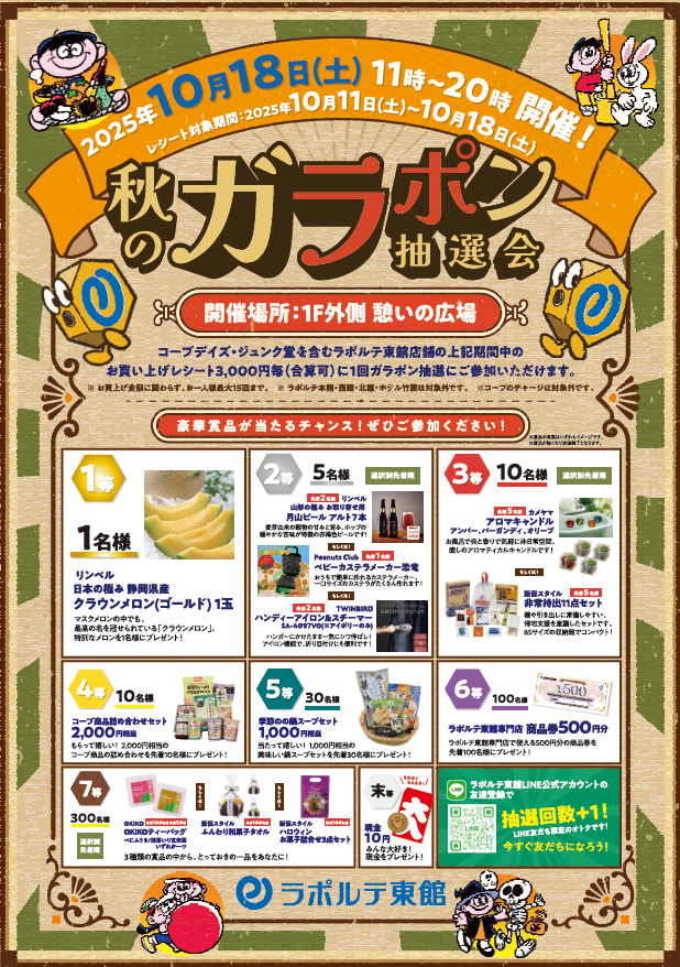 【東館】「秋のガラポン抽選会」の開催!! 期間:2025/10/10~2025/10/18 今回は盛りだくさんの景品をご用意しております! 開催日:10月18日(土) 開催場所:ラポルテ東館1F外側 憩いの広場 レシート対象期間:10月11日(土)から10月18日(土)まで