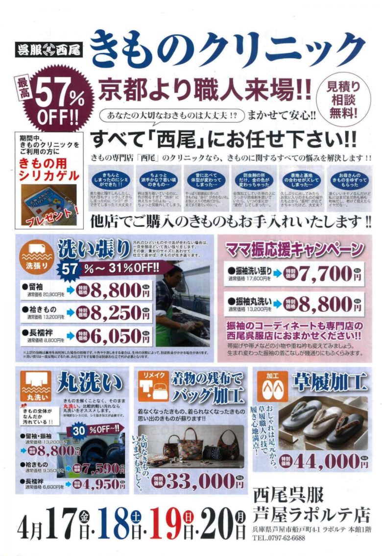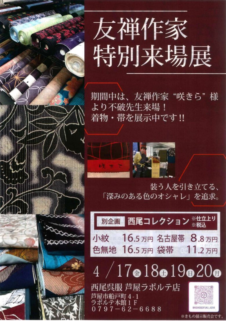 【本館1F】西尾呉服 友禅作家 特別来場展 2026/4/17(金)~4/20(月) 期間:2026/4/17~2026/4/20 本館1Fの「西尾呉服」からイベントのご案内! 2026年4月17日(金)~4月20日(月)まで 友禅作家さんをお招きして特別来場展を開催! 皆様この機会にぜひお楽しみください!
